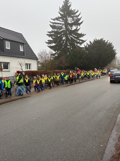 Am Freitag, den 12.12.25 war es soweit: Alle Kinder und Lehrerinnen gingen in einem langen Zug mit Leuchtwesten und Klassensternen unter Begleitung unserer Stadtteilpolizisten in die Vicelin-Kirche.